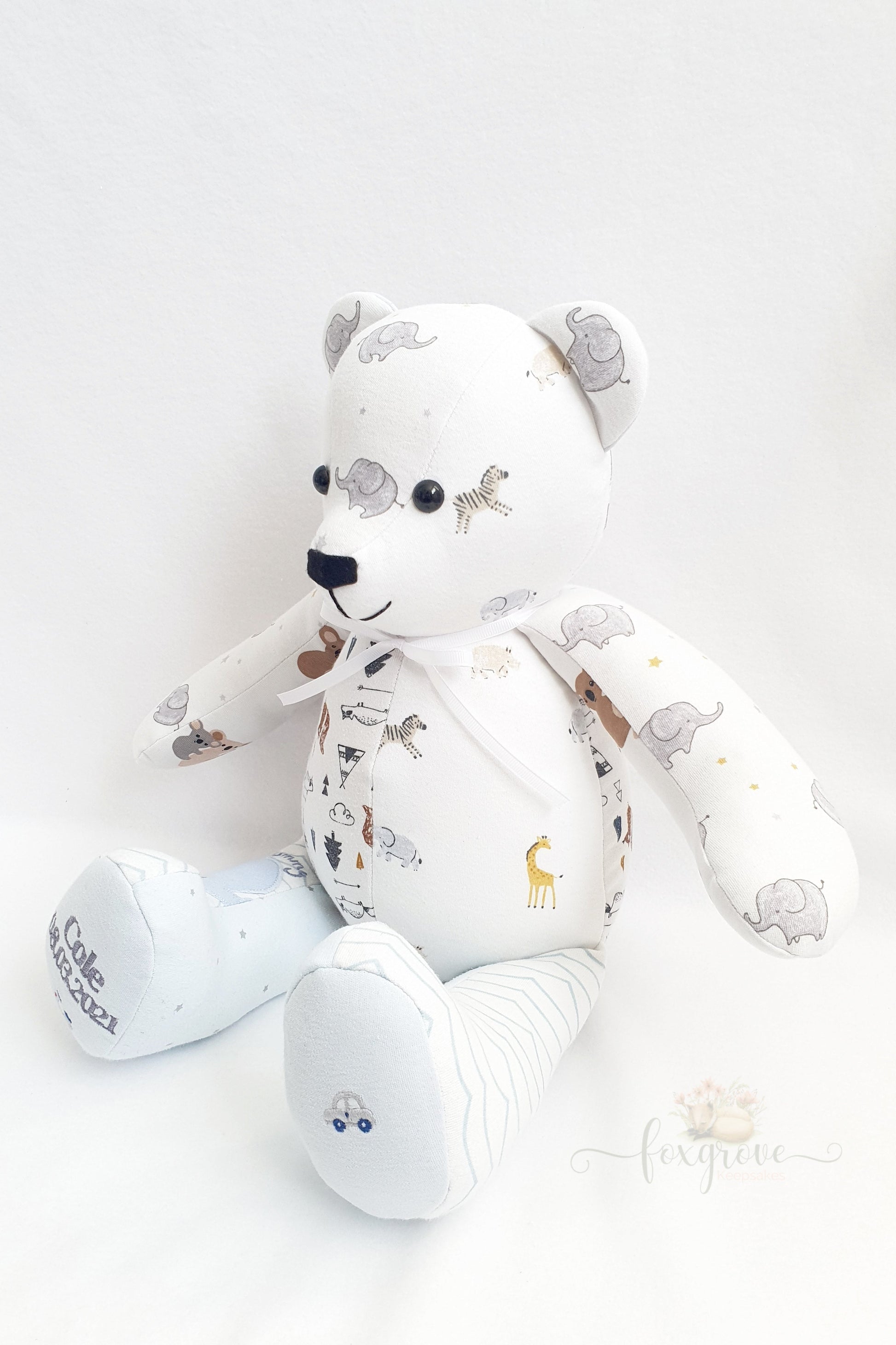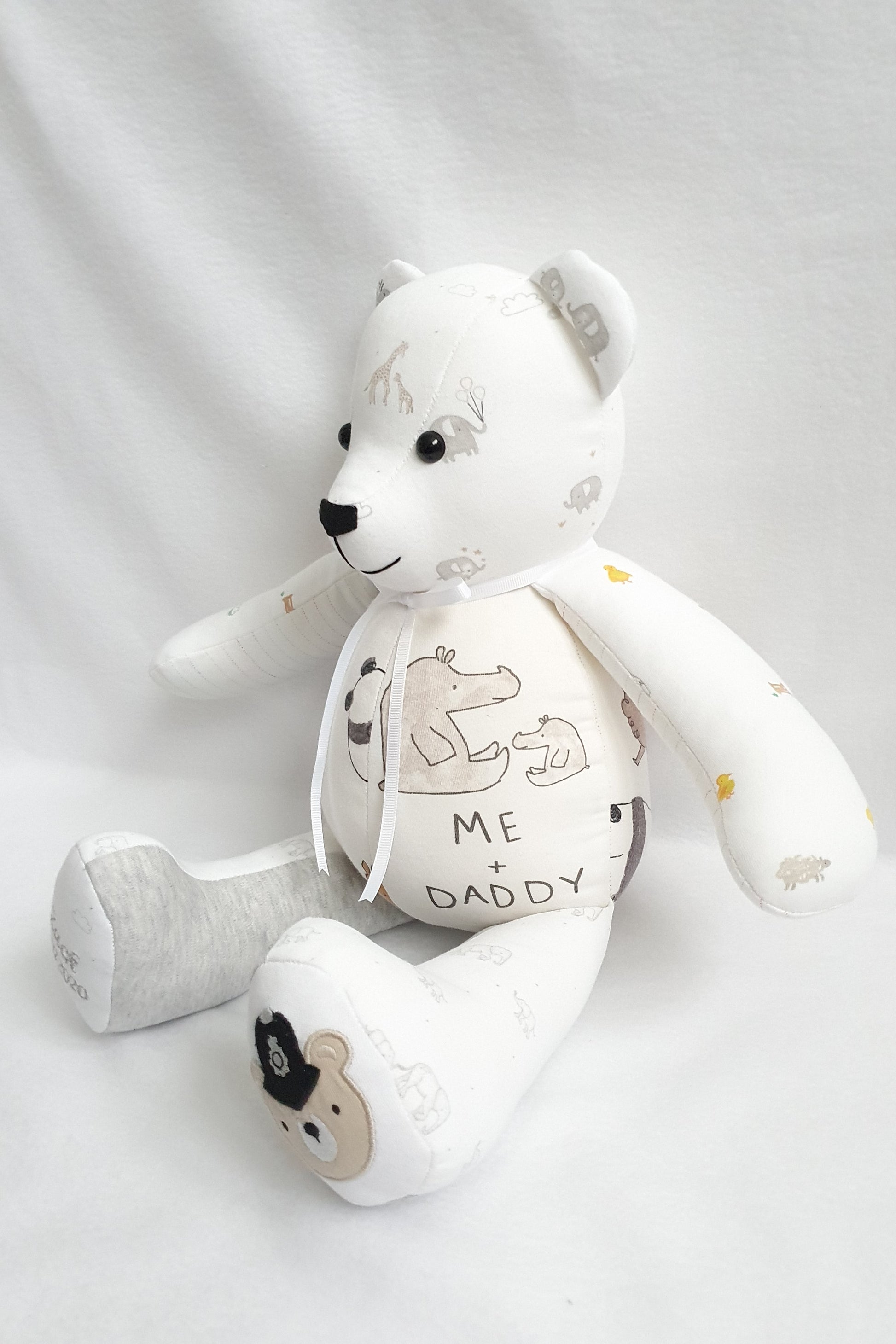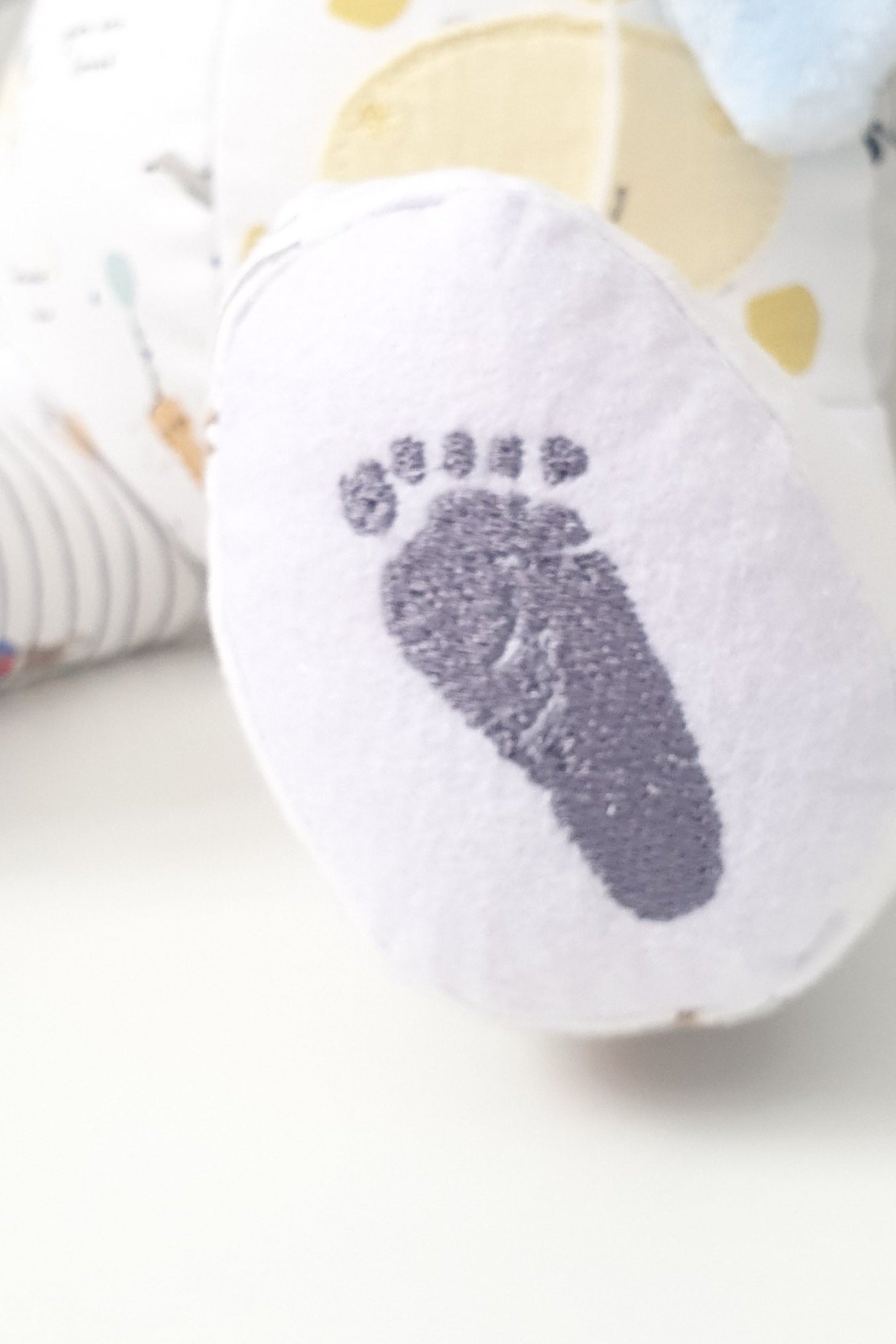 Personalisation Options: Add embroidery to make your memory Bear even more special! Personalise it with a name, date, message or even your baby's footprints -each footpad accommodates up to 3 lines of text, 8 characters per line. You can also enhance your keepsake with custom accessories; simply contact me for details.
